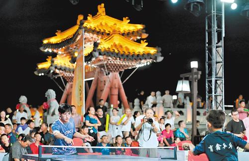 华灯初上,阳和楼东广场搭起了“正定乒乓”全民联赛赛场。比赛还没开动,三面看台就也曾坐得满满当当,就连阳和楼上,皆站了不少不雅众。晚7时,跟着一声锣响,5张球桌同期开赛。