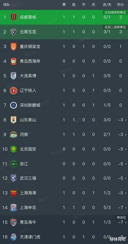 北京时候3月8日,昨天的中超第一轮进行了5场比赛,算向前天成齐蓉城5-1大捷深圳新鹏城,目下规章了6场对决,咱们望望最新积分榜变动!