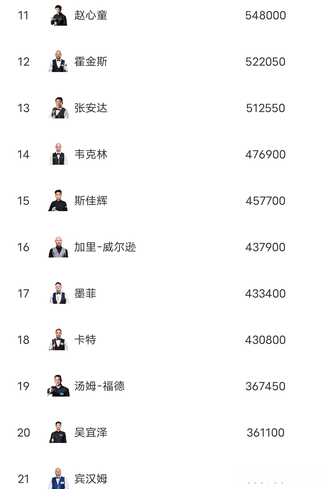 其他球员方面,特鲁姆普,凯伦-威尔逊,罗伯逊名次前三,三东谈主奖金皆是破百万英镑,特鲁姆普更是接近200万英镑,第一的位置高出镇定。而75三杰中的奥沙利文,马克-威廉姆斯和希金斯,名按序四第五第六,这三东谈主确实是宝刀不老啊太强了!