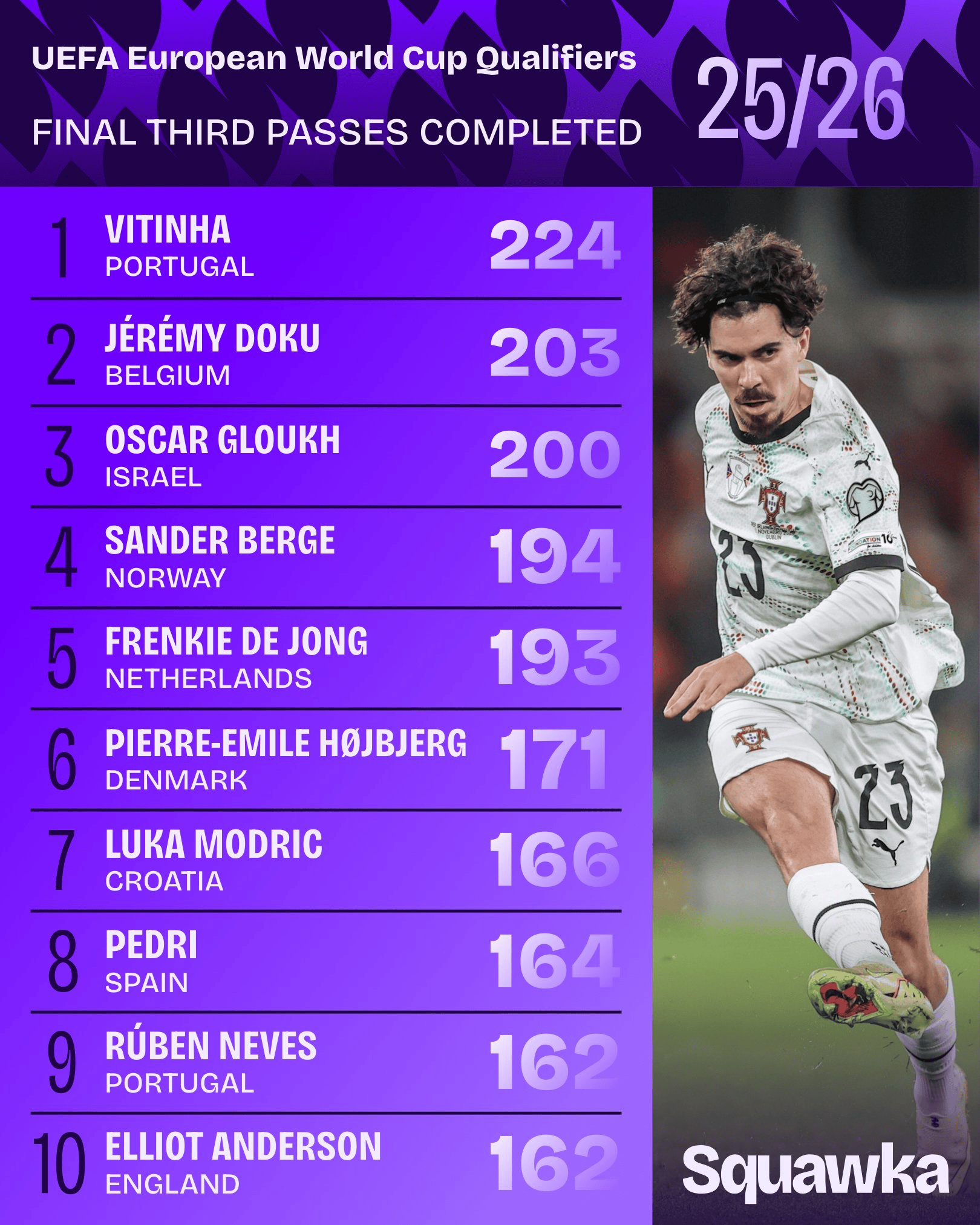 具体榜单如下:1.维蒂尼亚(葡萄牙)224次2.多库(比利时)203次3.格鲁克(以色列)200次4.桑德-贝格(挪威)194次5.德容(荷兰)193次6.赫伊别尔(丹麦)171次7.莫德里奇(克罗地亚)166次8.佩德里(西班牙)164次9.鲁本-内维斯(162次)10.埃利奥特-安德森(英格兰)162次体育集锦